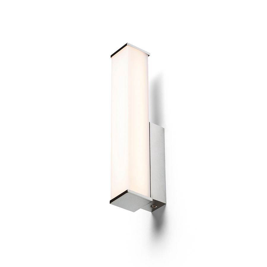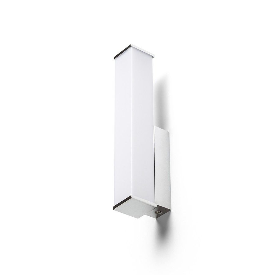 Falra szerelhető négyzet alakú LED-es lámpatest opálos burkolattal krómozott talapzaton. Alkalmas nedves környezetbe.