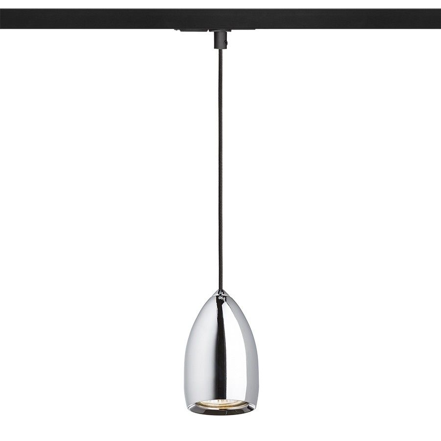 Függő lámpatest króm vagy matt nikkel búrával. A fekete textil kábelt adapter zárja az egy áramkörű sínbe.