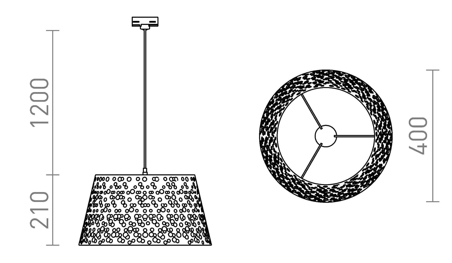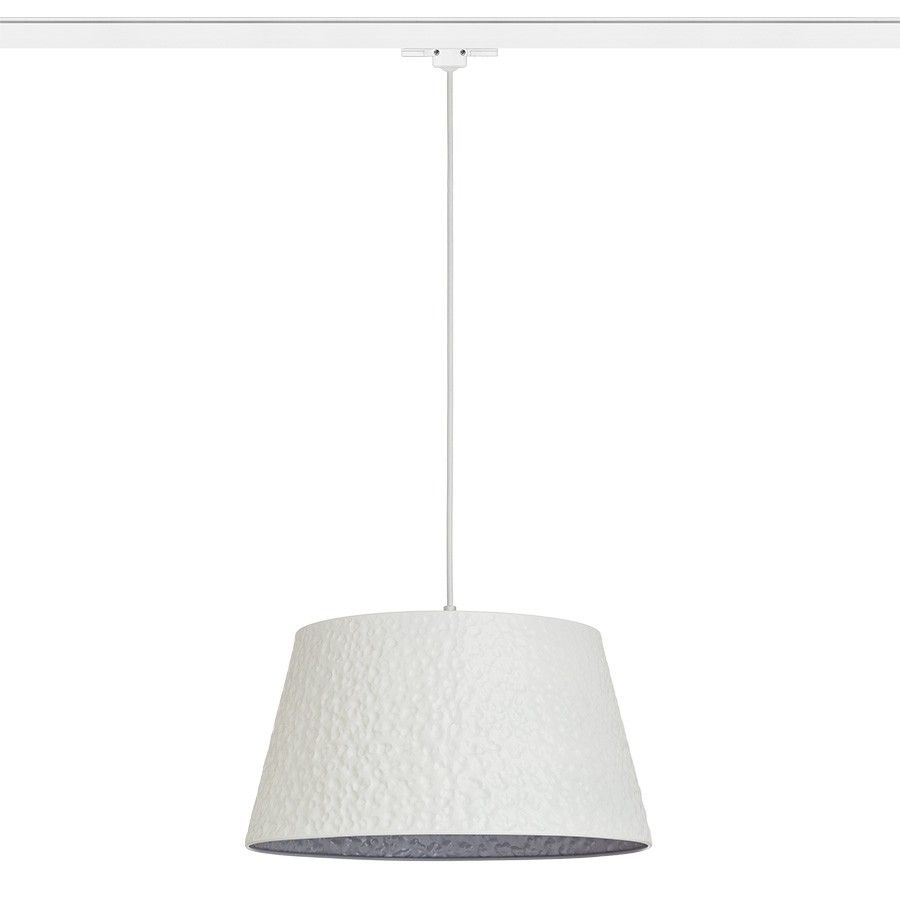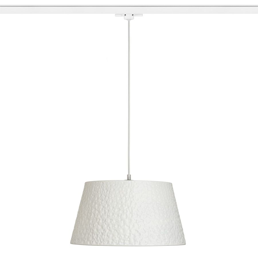 Fém függő lámpatest horpadt dekorációval. A tápkábelt adapter zárja, egyfázisú áramkörös sínbe.