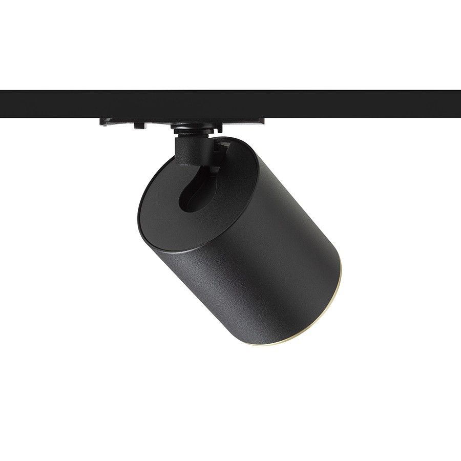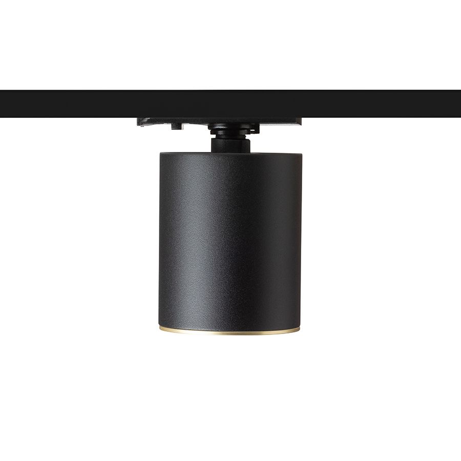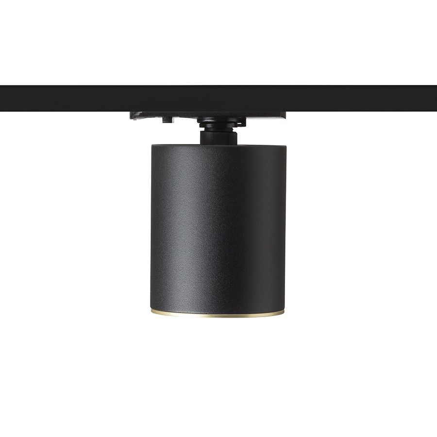 Hengeres lámpa egyfázisú áramkörű sínhez LED-izzóhoz GU10 foglalattal, fém díszgyűrűvel szálcsiszolt sárgaréz színben. A színváltoztatásra lehetőség van, fekete vagy fehér színű gyűrű válaszható.