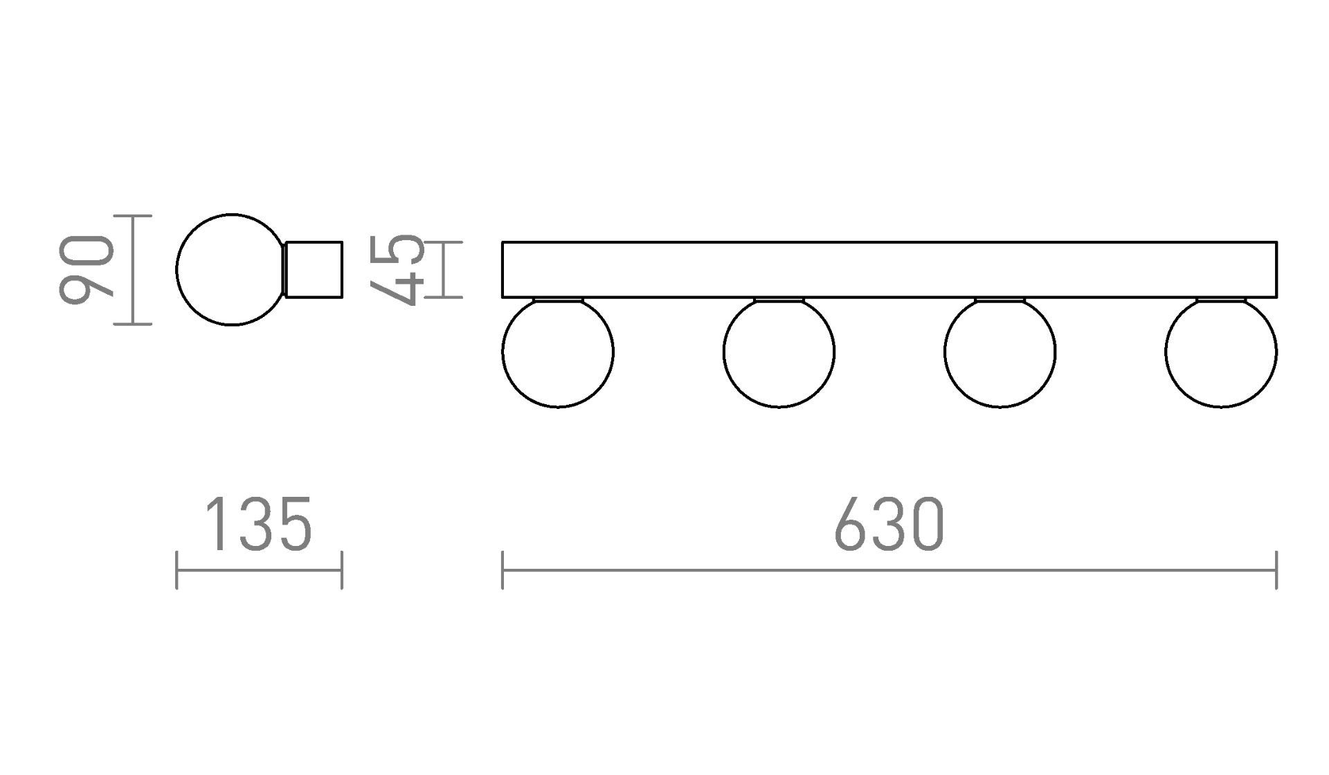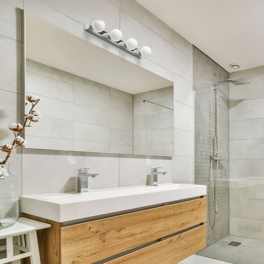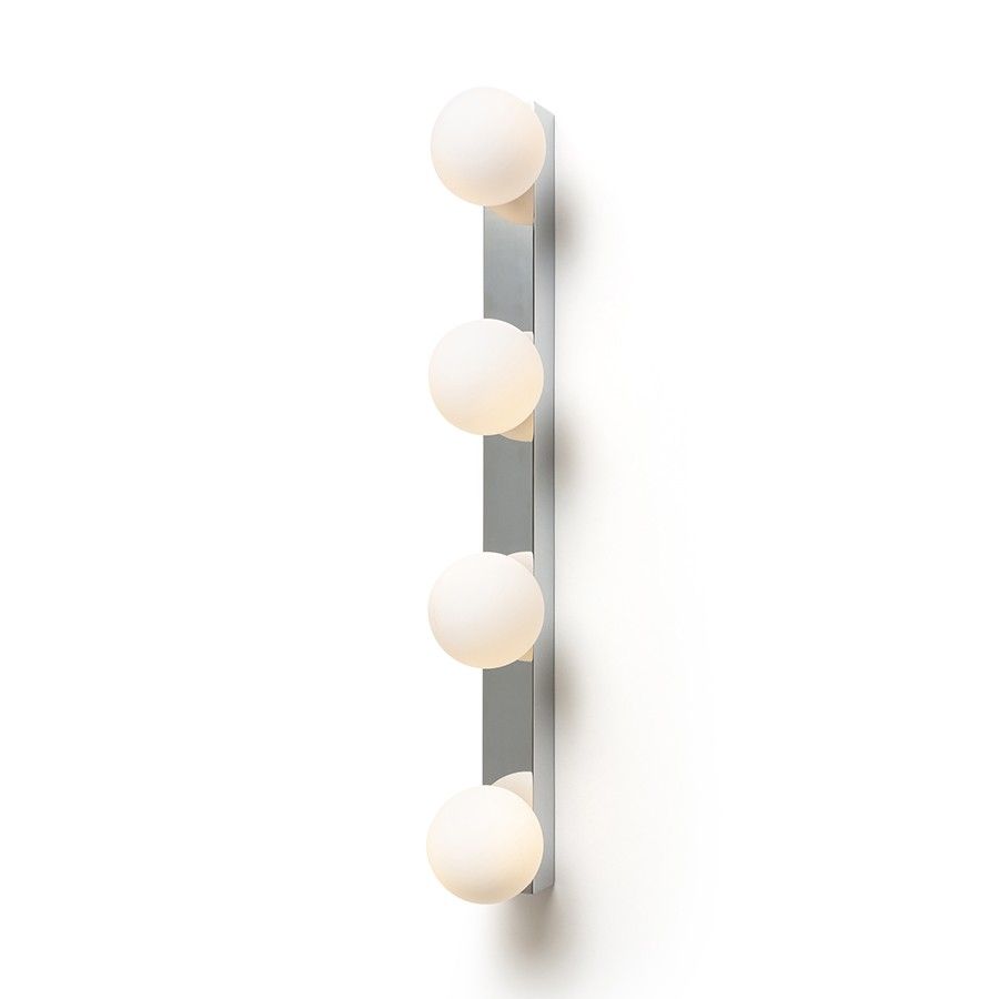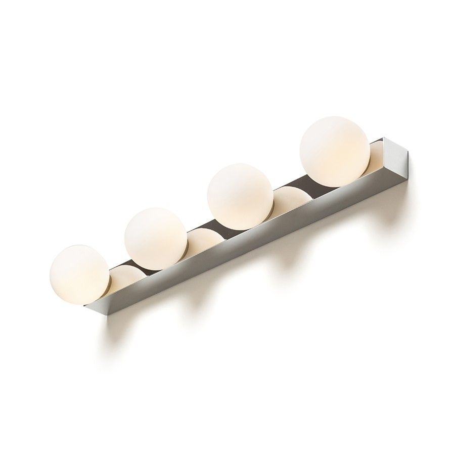 Fürdőszobai hosszúkás fali lámpa négy opálos árnyékolóval krómozott talapzaton. G9-es foglalattal rendelkező LED fényforrásokhoz alkalmas.