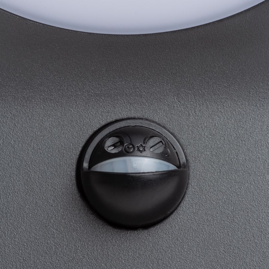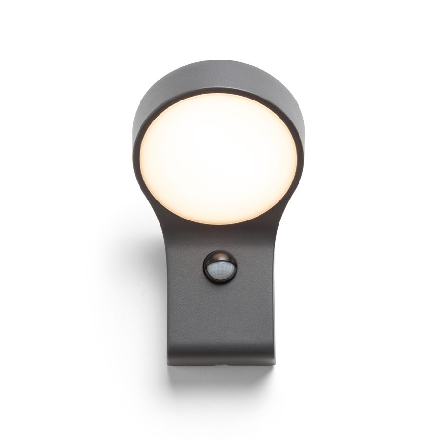 Falra szerelhető kültéri LED lámpa az Elia sorozatból tömör alumínium és opál búra kombinációval. Beépített mozgásérzékelővel.