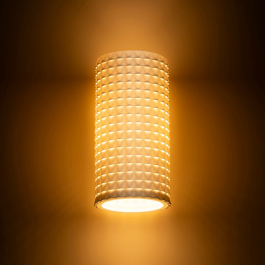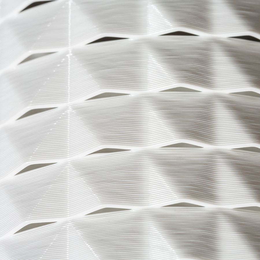Fali lámpa, amelyet 3D nyomtatással hoztak létre. Az ernyő környezetbarát PLA anyagból készült, amely teljesen lebomlik.