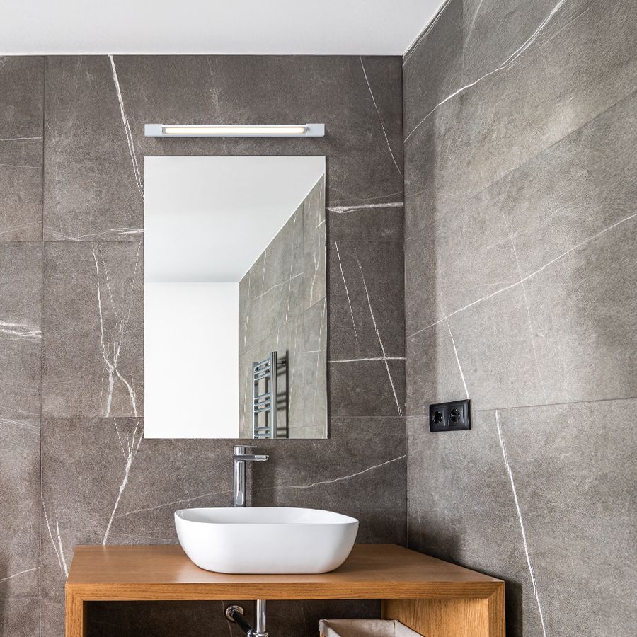 Lineáris LED világítótest, amely tükör fölé helyezhető. A világítótest elülső része vízszintes tengely mentén elforgatható. Alkalmas nedves környezetben való használatra.