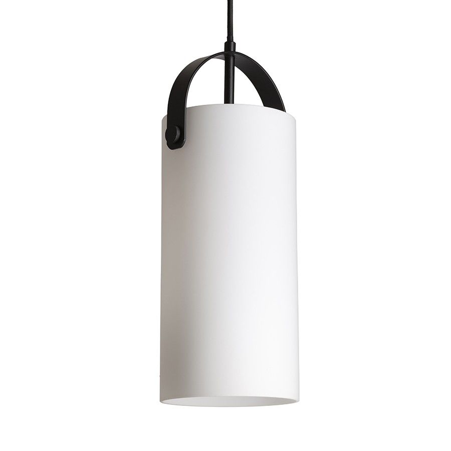 Függő design lámpatest opál hengeres üveggel. Festett fém elemekkel, fekete textil kábellel.