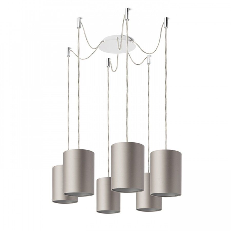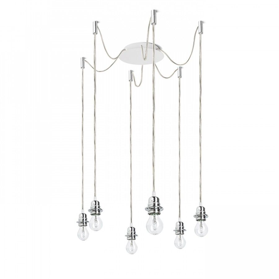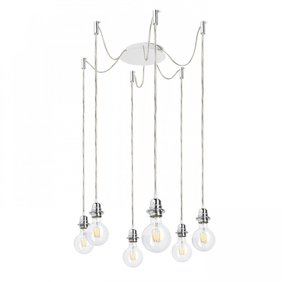 Függesztett lámpatest központi mennyezeti alappal és különálló textil karokkal E27 fém foglalattal, dekoratív izzókkal vagy textil lámpabúrákkal történő használatra. A zsanérok króm mennyezeti tartókkal vannak felszerelve, amelyeket az alaptól külön-külön választott távolságra lehet elhelyezni. A kábel teljes hossza 3 m.