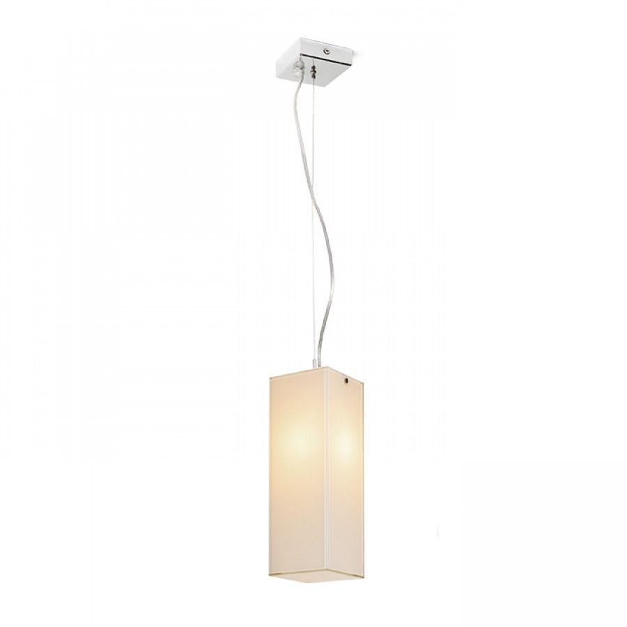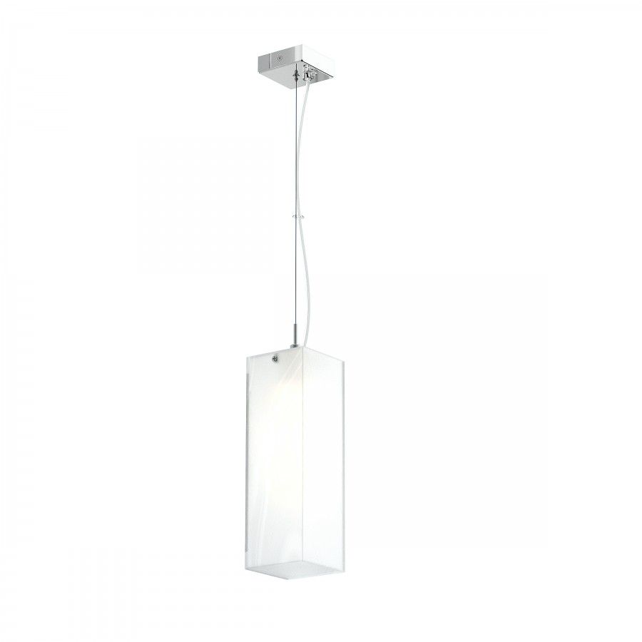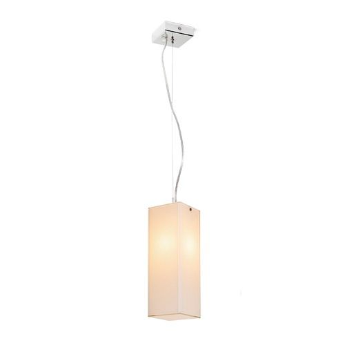 Függő lámpatest szögletes búrával szatinált üvegből. A mennyezeti alap és a kiegészítők krómozottak.
