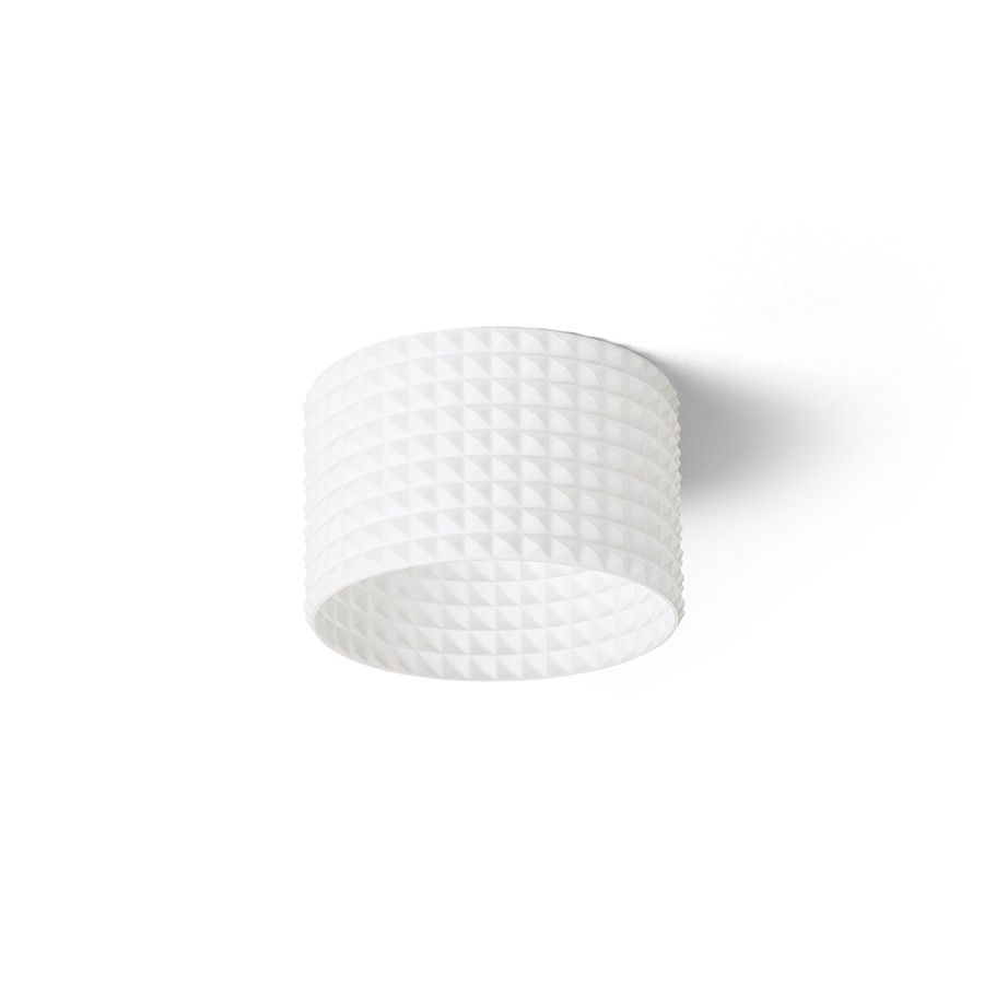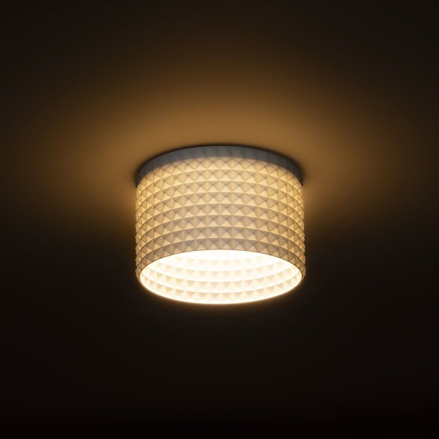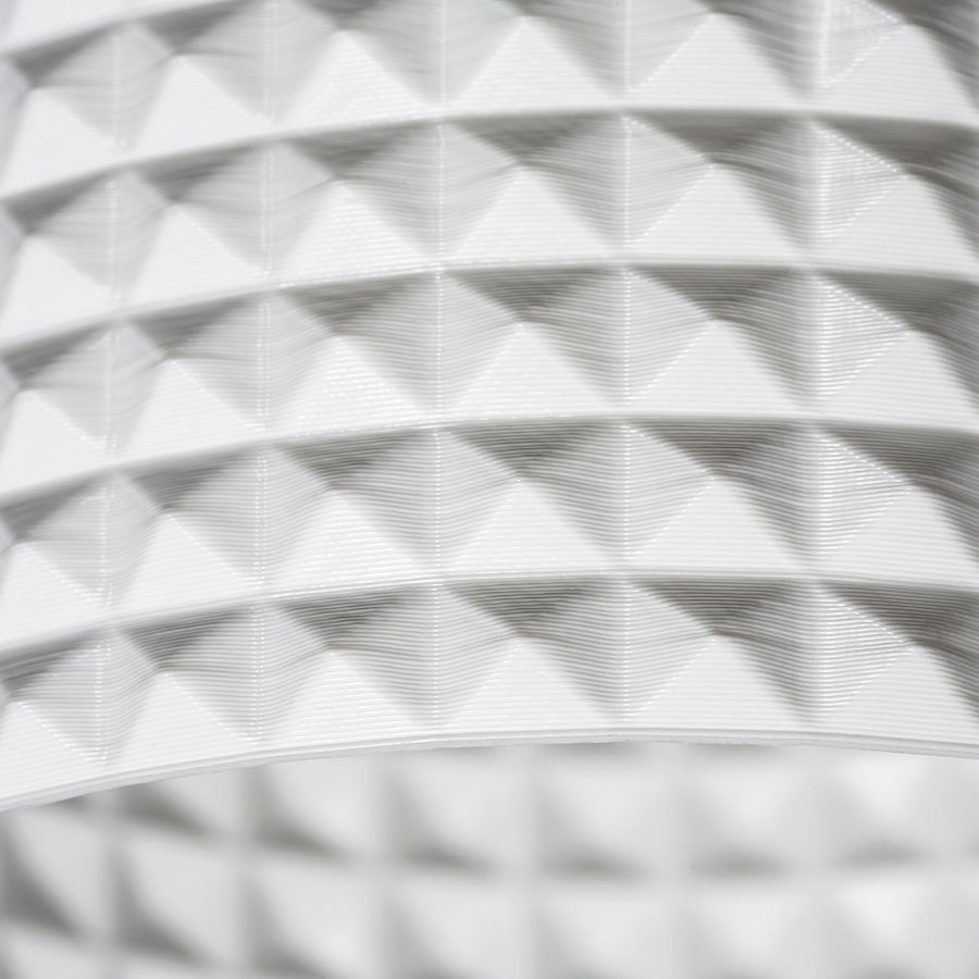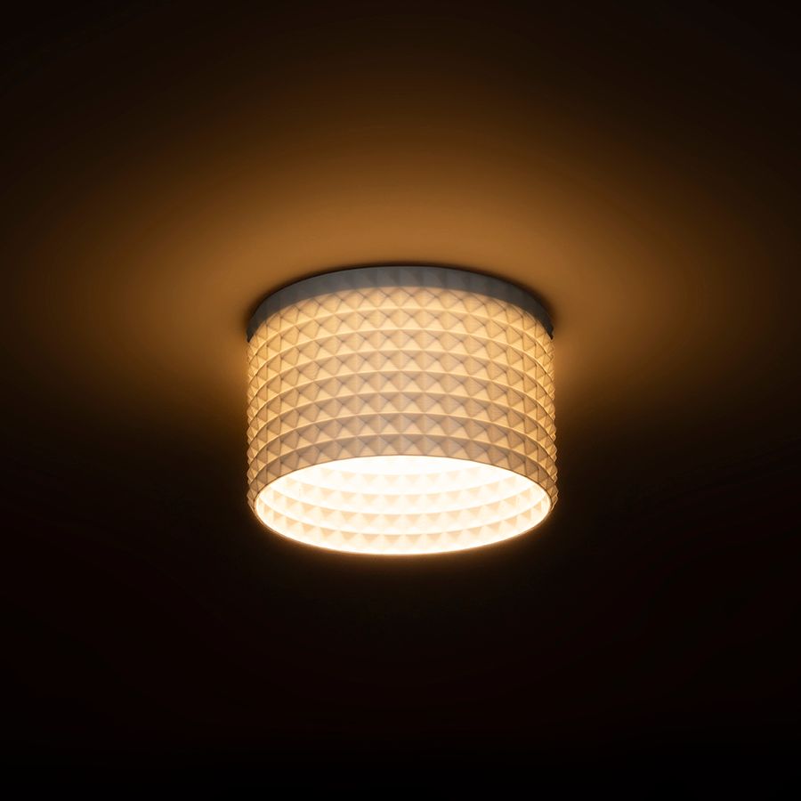 Alacsony beépítésű, vakolt mennyezetbe szánt LED lámpa dekoratív árnyékolóval. Az árnyékolót 3D nyomtatással készítették. Környezetbarát PLA anyagból készült, mely teljesen lebomlik. A szerelőlyuk mérete a csúsztatható rögzítő rugókkal állítható. A lámpa kényelmesen kicserélhető a meglévő halogén lámpák helyett, anélkül hogy módosítani kellene a szerelőlyukakat.