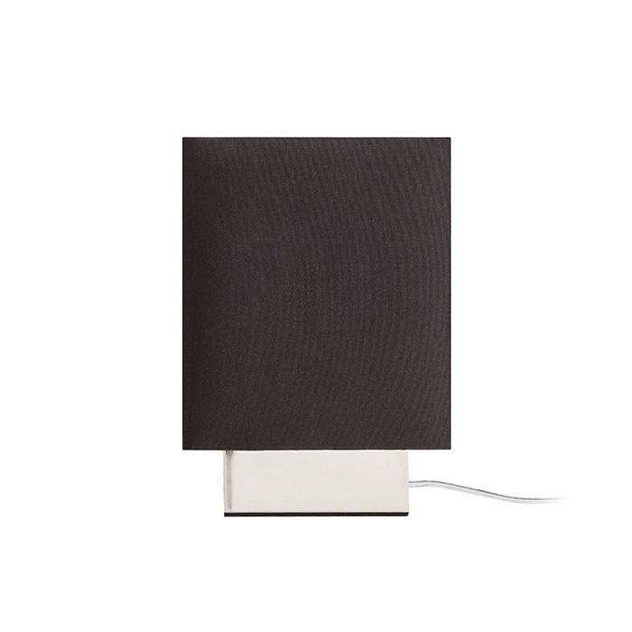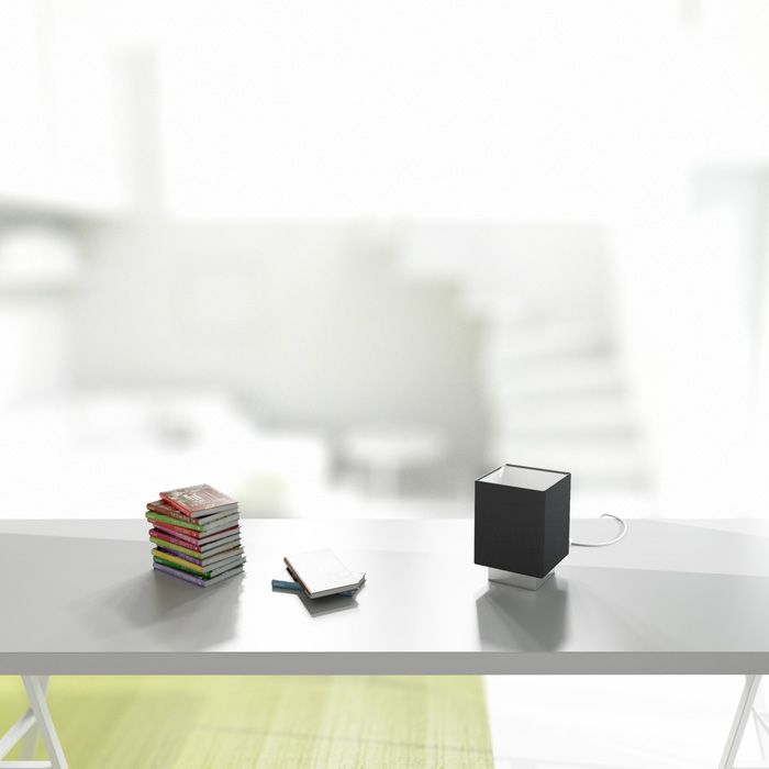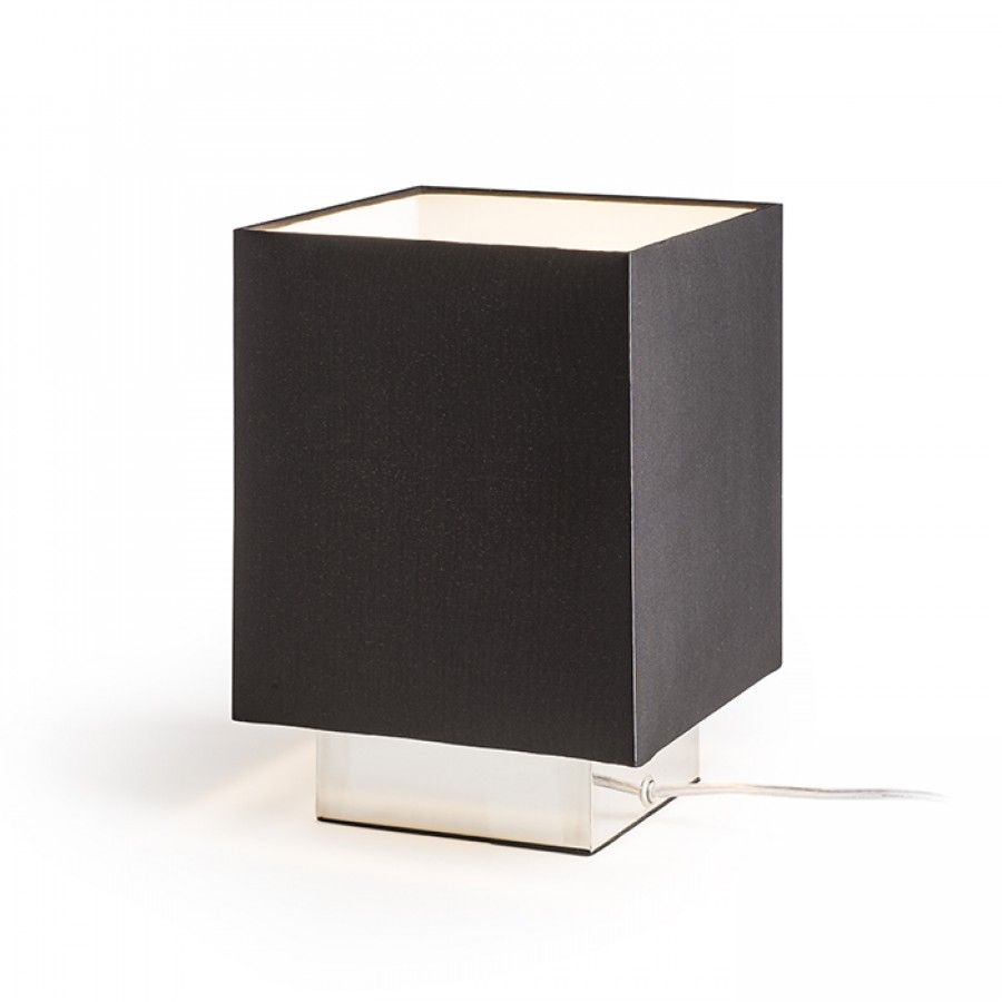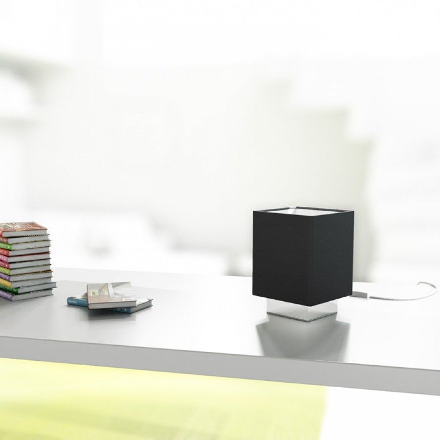 Kompakt asztali lámpa fekete textil búrával króm alapon.