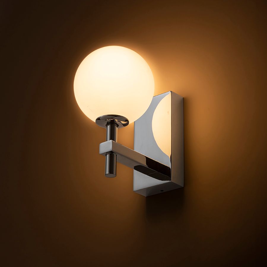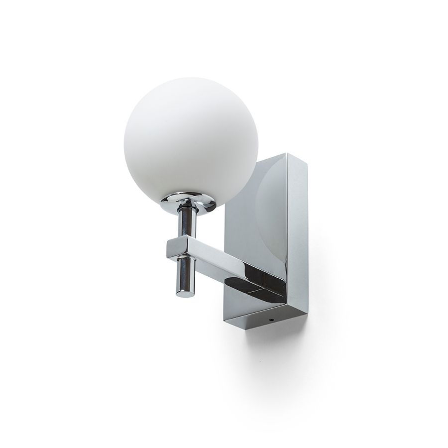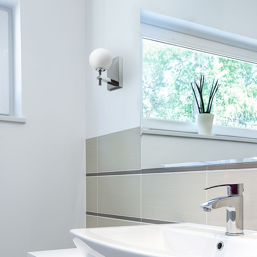 Fürdőszobai fali lámpa kerek opálüveg árnyékolóval krómozott talpon. G9-es foglalattal rendelkező LED fényforrásokhoz alkalmas.