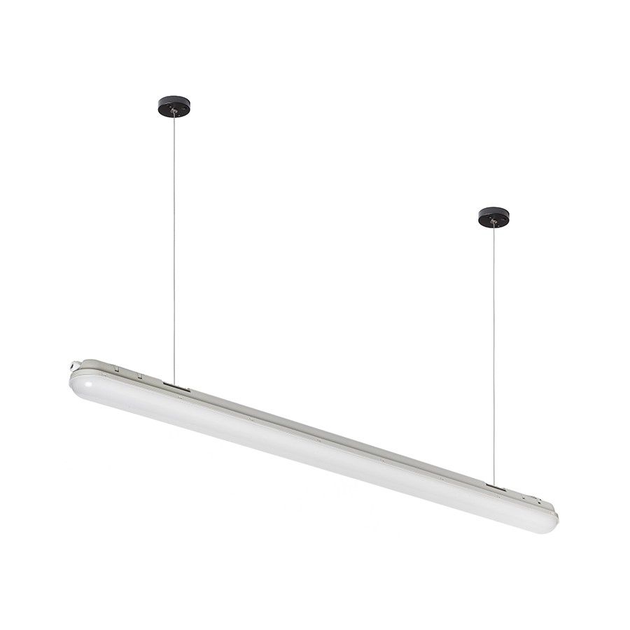 Ipari lineáris LED lámpatest mennyezetre szereléshez vagy felfüggesztéshez a G13672 készlet segítségével. Nagy teljesítmény és IP65 védelem. Felfüggesztőkészlet és tápkábel nélkül szállítjuk. A lámpatestek soros összekapcsolására van lehetőség.